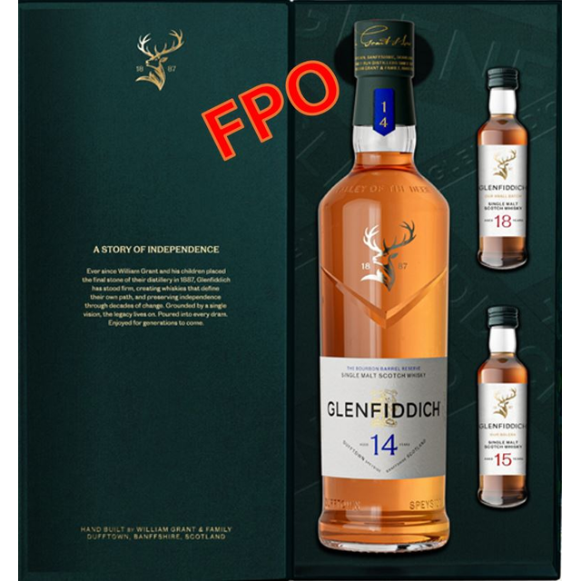 1 bottle of Glenfiddich 14 YR with one 50ml bottle of Glenfiddich 15 YR and one 50ml bottle of Glenfiddich 18 YR