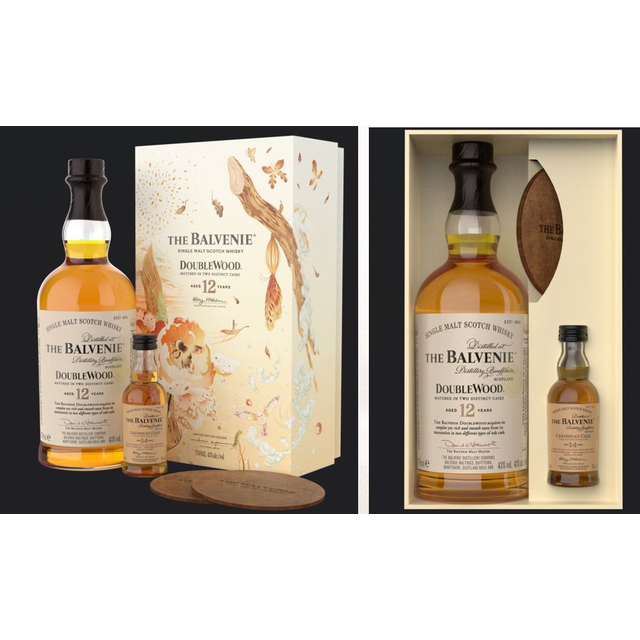 Balvenie 12yr 750ml bottle with 2 leather coasters and one 50ml bottle of Balvenie 14yr Caribbean Cask