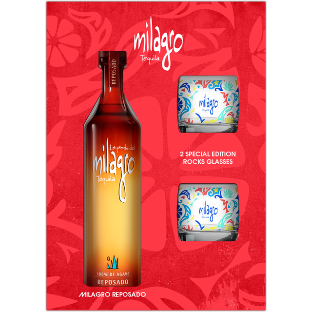 Milagro Reposado 750ml with 2 glass tumblers