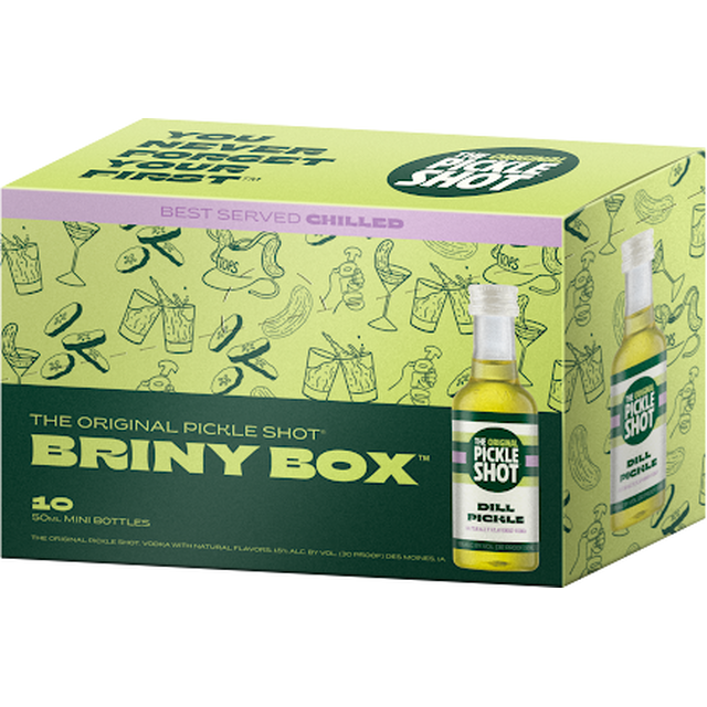 The Original Pickle Shot now offers a 10 pack 'Briny Box' of your favorite pickle flavored vodka. Crafted with the some of the best pickle brine in the U.S five-times distilled corn vodka and ZERO artificial flavors or sugar. Proudly made with love (and